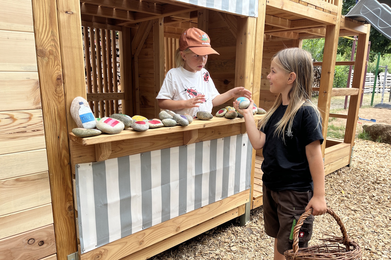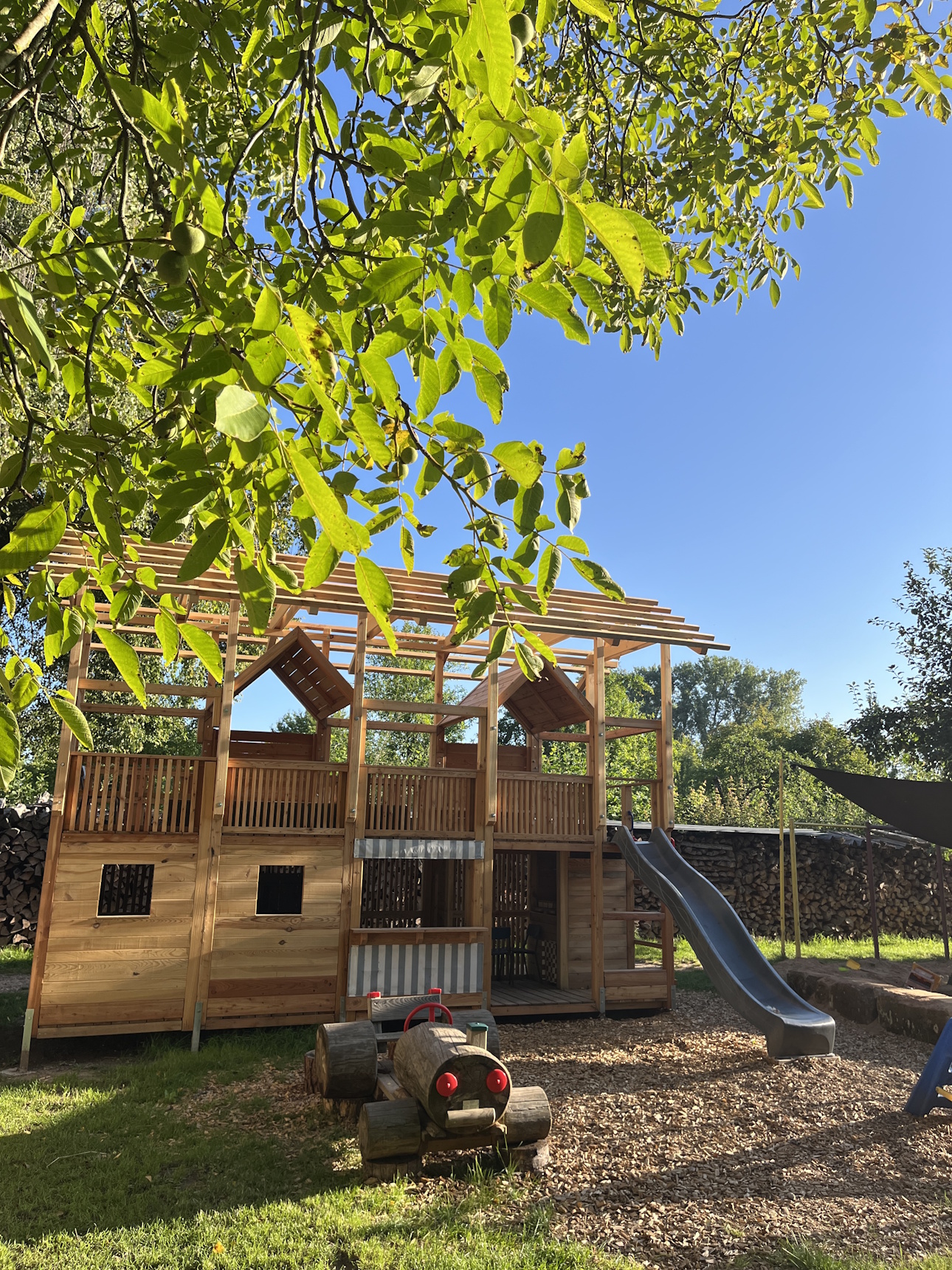 Während eure Eltern sich es unter dem unserem Apfelbaum gemütlich machen, könnt ihr barfuß durch den Garten mit euren Freunden flitzen und vieles erleben. Auf unserer Spielwiese könnt ihr Fußballturniere austragen oder Fangen, Verstecken und vieles mehr spielen. Dabei schauen euch unsere Ziegen zu, die gerne das frische Gras dort fressen. Wer klettert am höchsten auf unseren Kletterbaum und wer baut die schönsten Sandburgen in unserem großen Sandkasten. Die besten Sandkuchen und Gänseblümchensuppen werden in unserer Matschküche zubereitet. Im großen Trampolin könnt ihr üben Saldos zu schlagen.